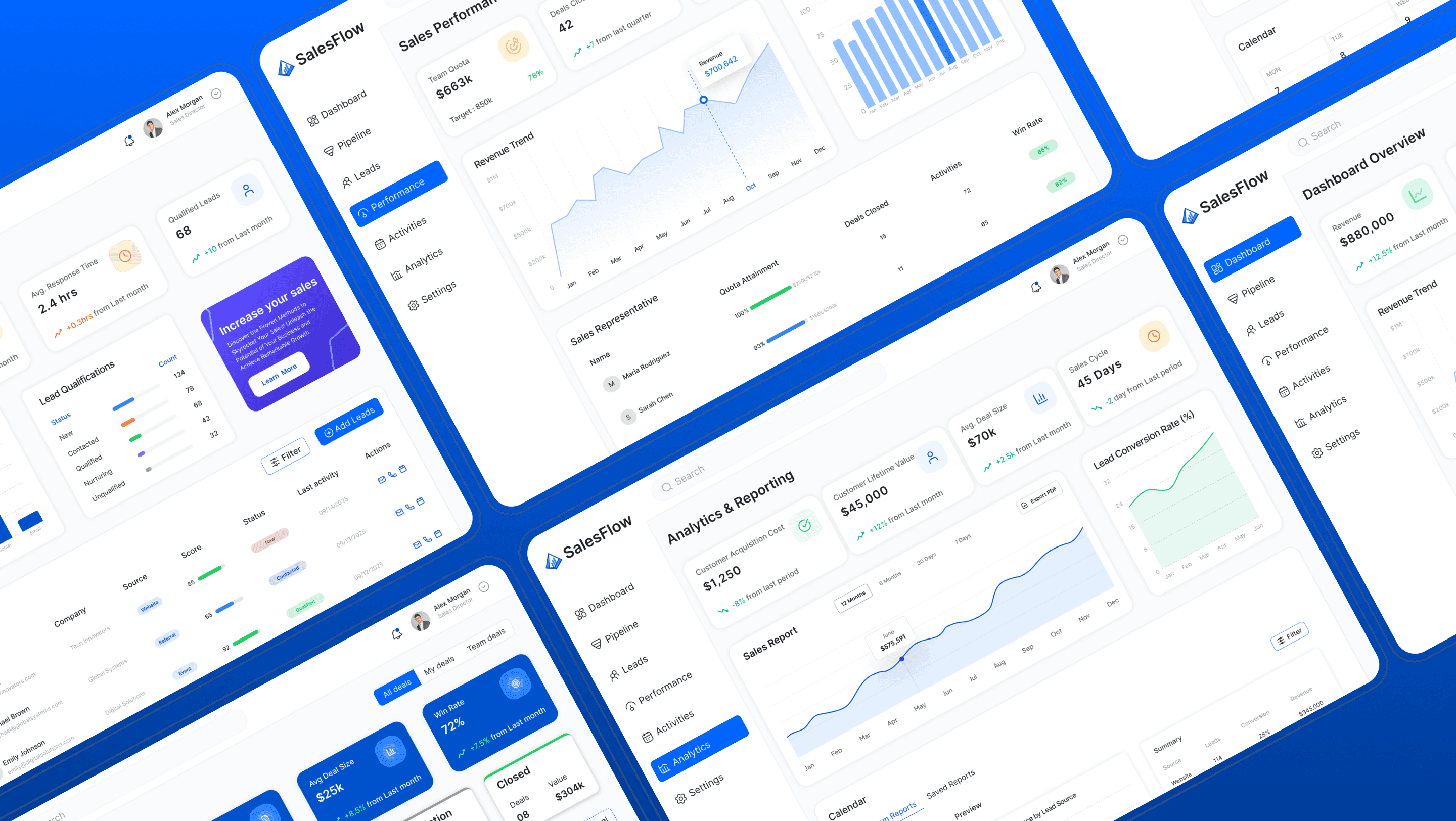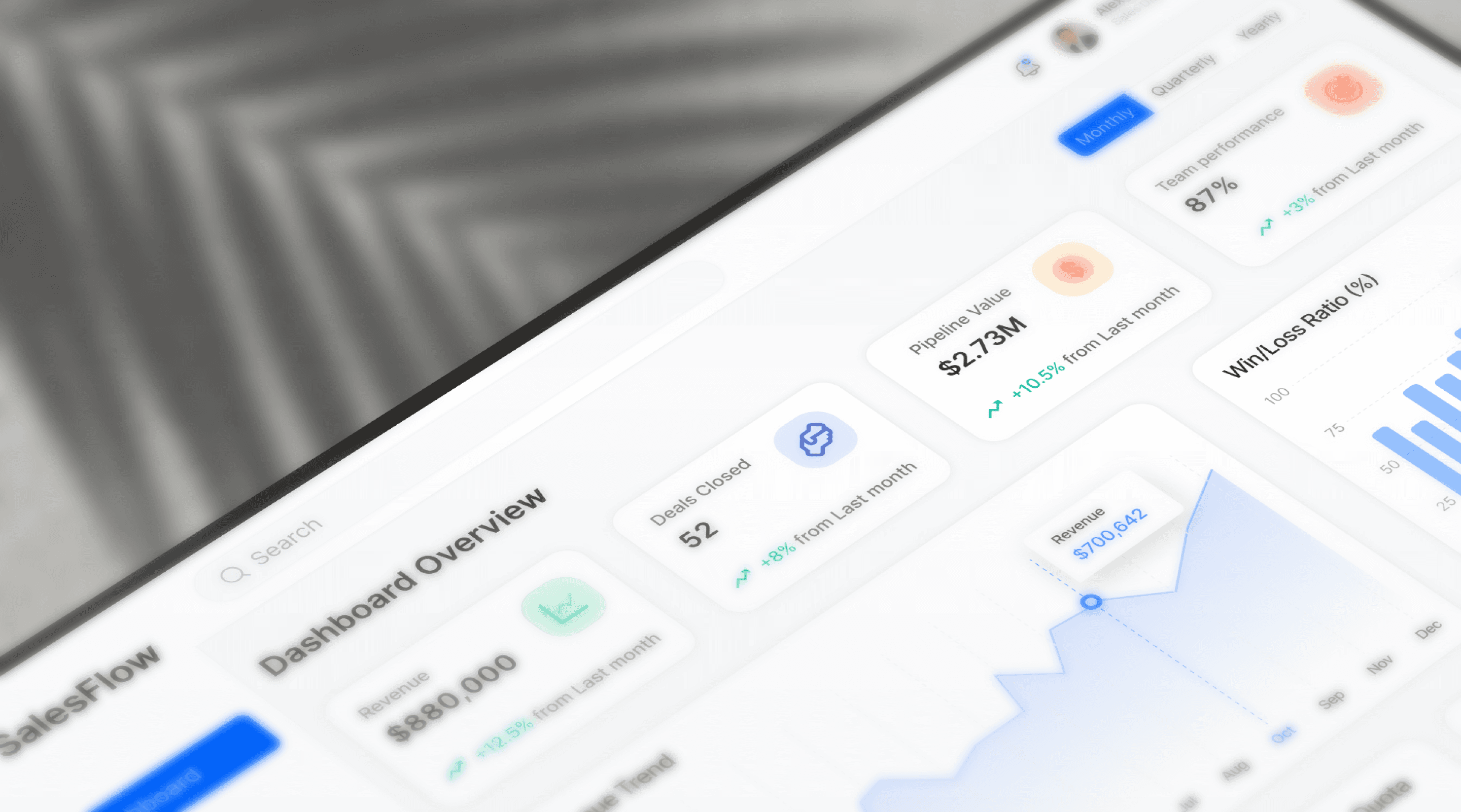 Overview: SalesFlow is a sales analytics dashboard designed to help teams monitor performance, track KPIs, and make faster decisions. The challenge: translate high-density data into a clean, scannable interface that guides attention to what actually matters.
